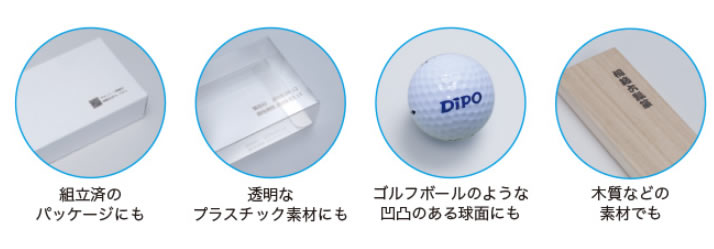アルミなどの金属、木、プラスチック、紙、フィルムなど多様な素材の立体物にキレイにプリントできます。